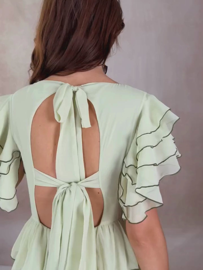 Soft layers of airy chiffon cascade into a dramatic, floor-sweeping silhouette. Featuring flutter sleeves, a tiered skirt, and a tie-back neckline with an open back detail—this gown moves like poetry.